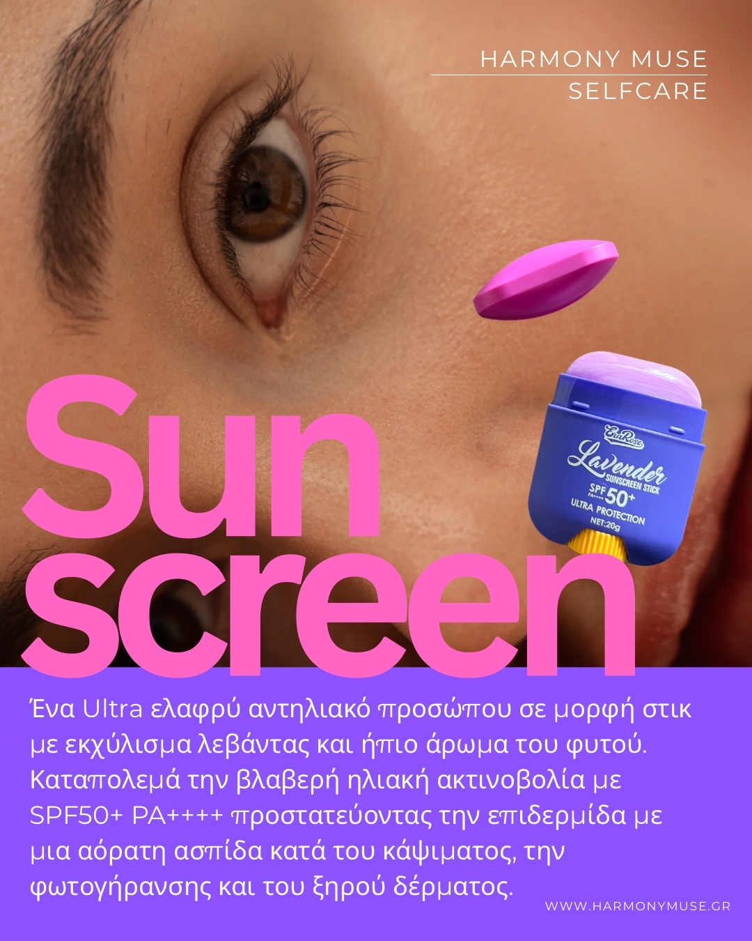 Ένα Ultra ελαφρύ αντηλιακό προσώπου σε μορφή στικ με εκχύλισμα λεβάντας και ήπιο άρωμα του φυτού.