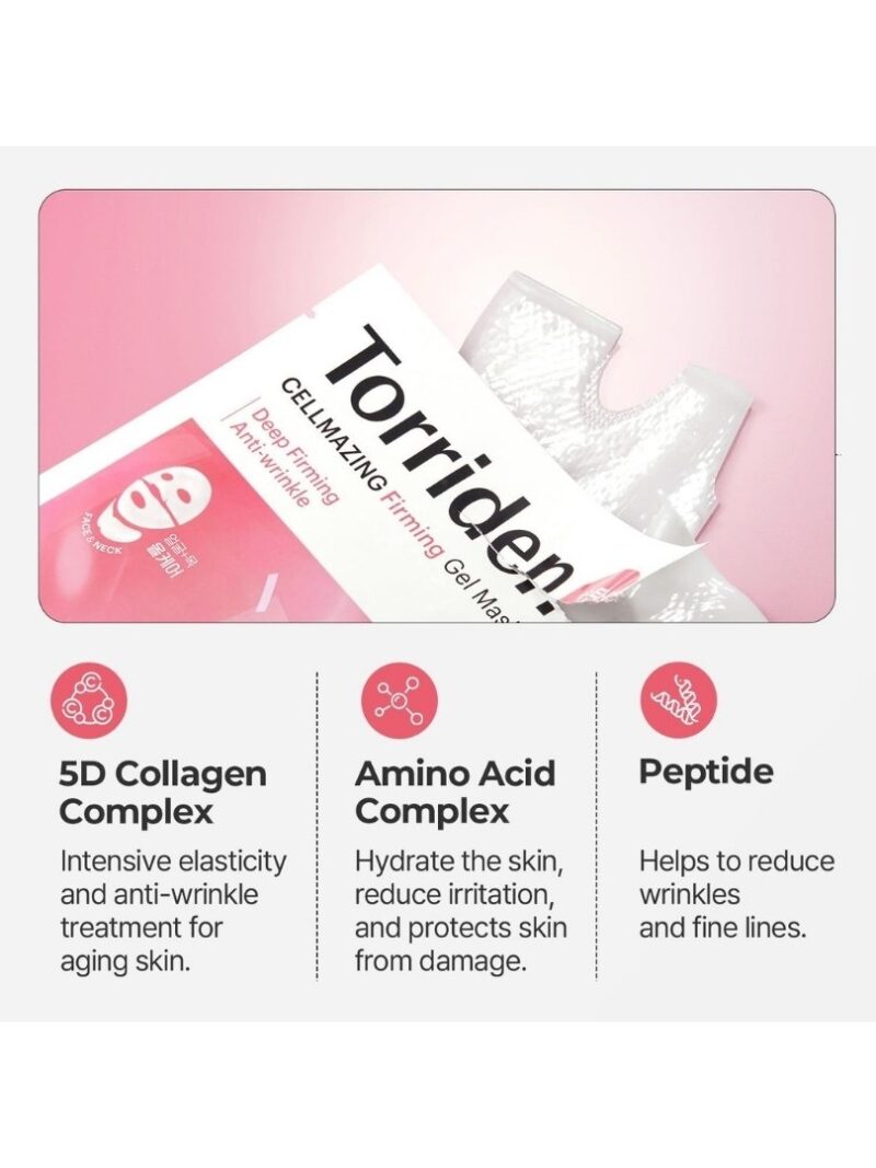 Η Torriden Cellmazing Firming Gel Mask είναι μια συσφικτική – αντιγηραντική μάσκα για το πρόσωπο και το λαιμό, υπόσχεται ελαστικό, σφιγηλό και νεανικό δέρμα άμεσα μετά την εφαρμογή της. Έχει υψηλή περιεκτικότητα σε πεπτίδια, κολλαγόνο και αμινοξέα, ενώ η σύνθεση της είναι ανάλαφρη και ταυτόχρονα παρέχει ενυδάτωση και σύσφιξη. Ο φάκελος περιλαμβάνει μάσκα προσώπου και μάσκα λαιμού.